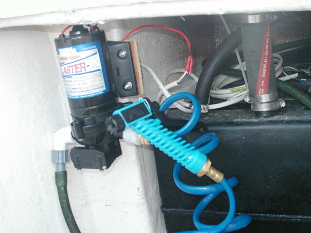 Wash down pump in lazarette, I plan to add a pressure line to the anchor locker, note: I did not use a thru-hull, see next picture