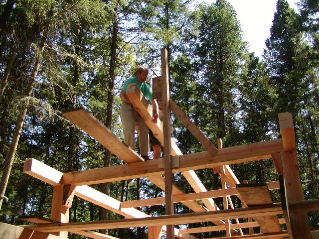 Bill and I placing the ridge beam on the workshop