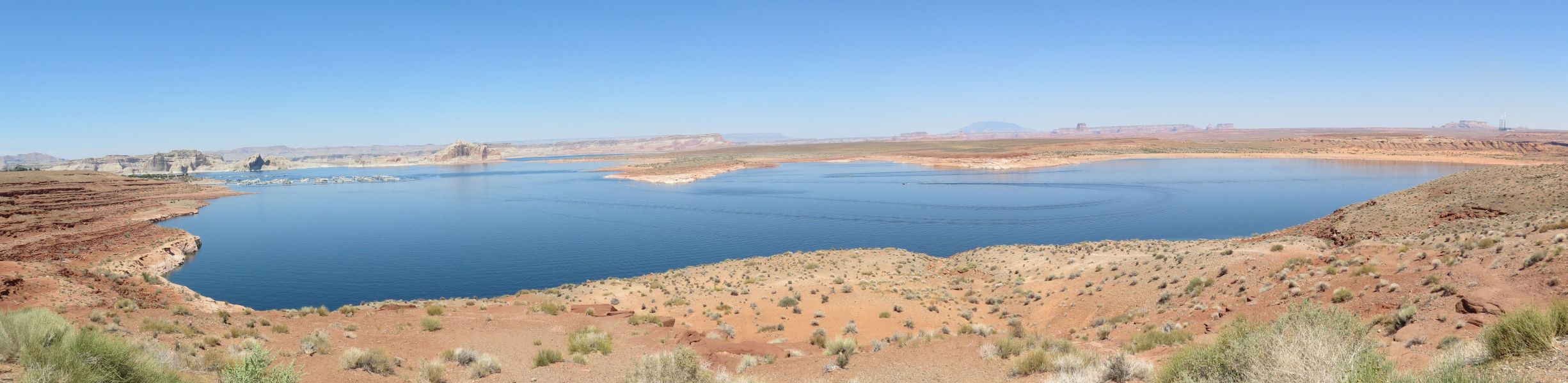 Lake Powell, 1,932 square miles, marina on left, hundreds of giant houseboats