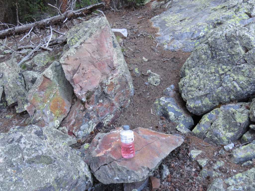 The 200 pound rock my water bottle is on cracked off as I used it as a handhold climbing the rocks. Just graised me as it fell. Could have been much worse.