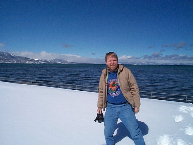 Tom with Lake Tahoe in the back. We had to wade through the snow to get this shot.