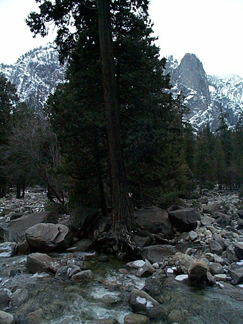 At the other end of the fall, the water rushes over rocks and by large trees.
