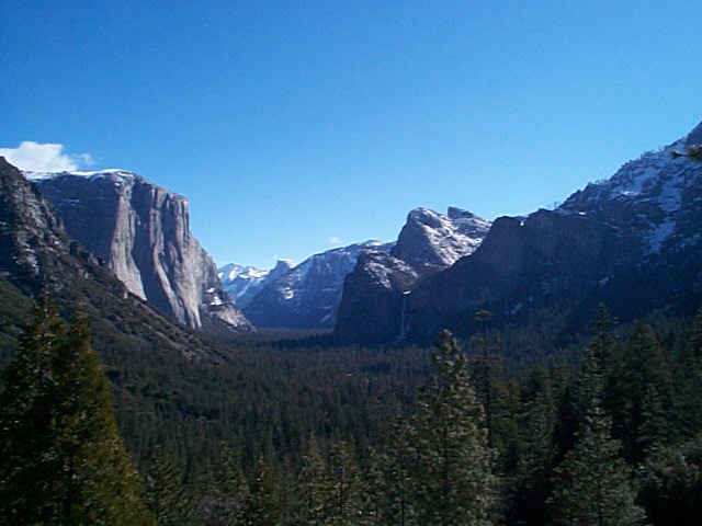 Half Dome is in the background. Half Dome rises an elevation of 8,842 feet. The Dome is stated to be 87 million years old. The legend goes like this: At one time, many birds, animals, and people lived in Yosemite Valley. One of them went to Mono Lake and wed Tesaiyac, a Native American woman, and decided to return with her to Yosemite. They began their journey, he carrying the deerskins and she holding the baby in her arms with the cradle on her back. When they reached the site of the present day Mirror Lake, they began to quarrel. She wanted to go back to Mono Lake, but he refused, saying that no oaks or other trees grew there. He would not listen to her when she said she would plant seeds. In despair, Tesaiyac began to cry and ran back toward Mono Lake. Her husband grew angry and ran after her. Tesiayac threw the basket at him, and it became Basket Dome. She continued running and threw the baby cradle at her husband. Today, we see it as the Royal Arches. Because they had brought anger into Yosemite, the two were turned into stone. He became North Dome, and she became Half Dome. Tesaiyac regretted the quarrel and began to cry, thus forming Mirror Lake. Today, you can still see the marks of those tears as they run down her face. And if you look very carefully at Half Dome, you can see it is fashioned after the way the Mono tribe looked - with hair bobbed and cut in bangs.