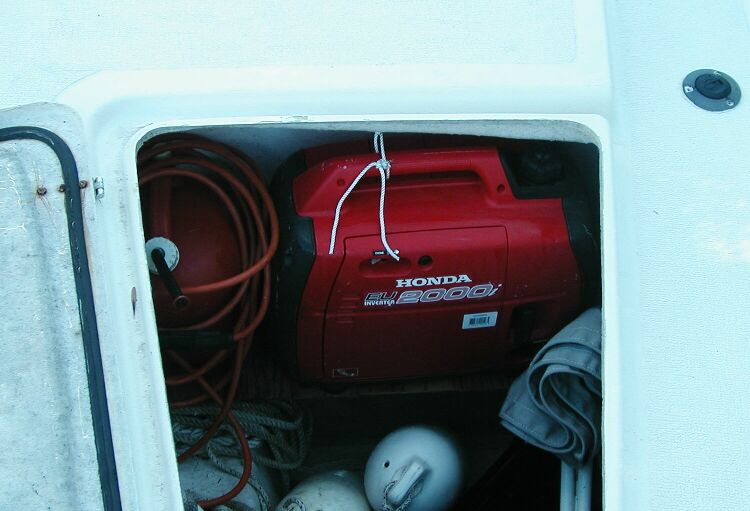 Generator (Honda EU-2000) storage in sail locker; keeps gas away from engine and spark sources; added a small shelf and safety line to support it; I run it on foredeck, in a anchor locker if rough