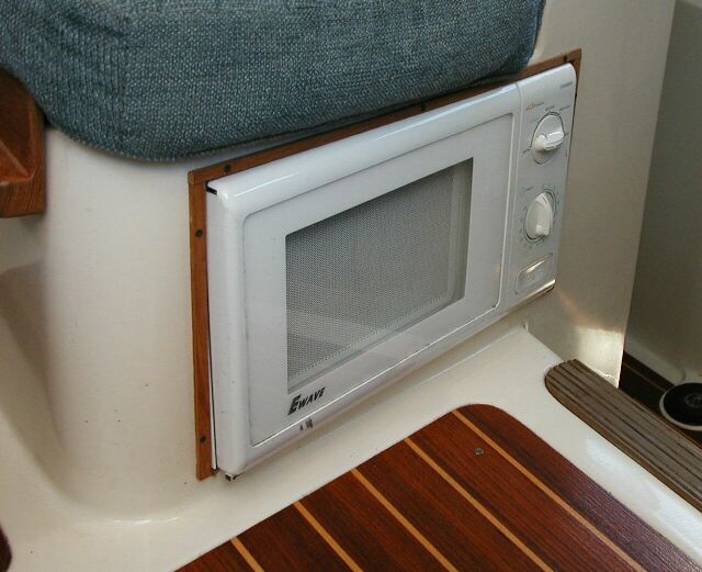 Microwave oven under dinette seat; Tony does this on some boats; very easy to install; recommend an oven with mechanical timer, not electronic