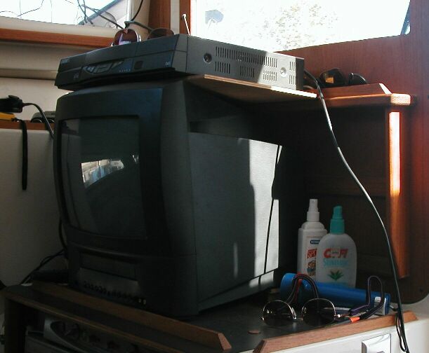 TV/VCR with satellite receiver; a laptop PC on top is visible while steering