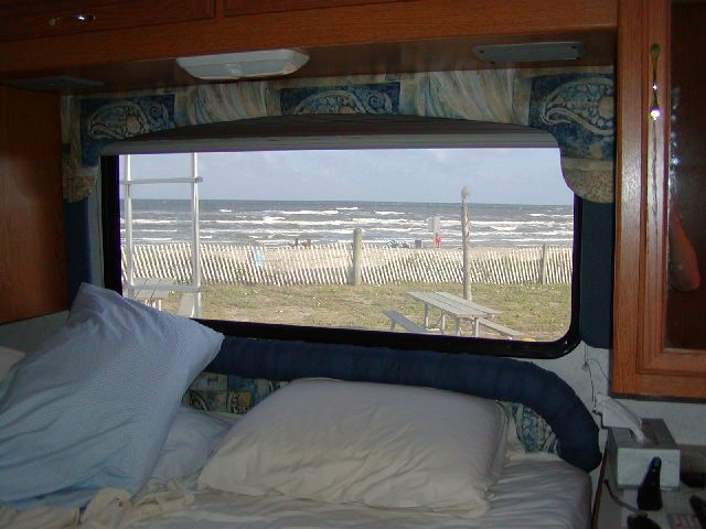 Beach view from my bedroom at Dellanara RV Park in Galveston